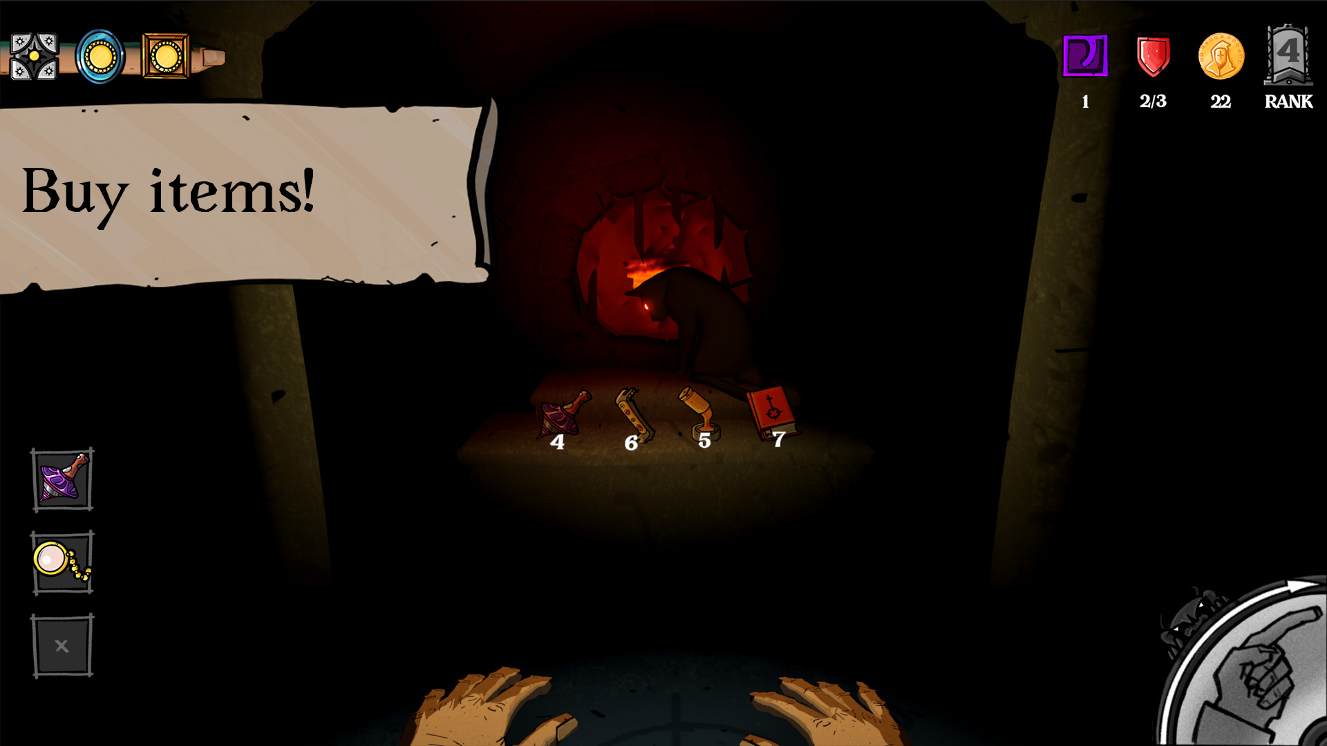 Quick money grab (better if 50$ discount ring is obtained): Buy the 5 gold per bullet upgrade and the tool to open the gun (22 gold together or 11 gold with discount). Put all the bullets in the chamber, use the item to get 30 gold, and then re-open the chamber and remove additional bullets. Alternative, keep the bullet upgrade item until the end of a run, shoot until you're hit (requires extra health), then pump the bullets in, and use the item before finishing the ritual.
